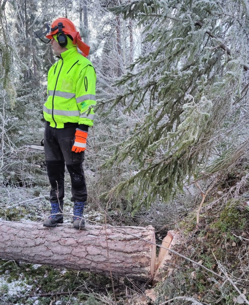 Hoidan nurmikonleikkuut, haravoinnit ja lumityöt. Metsäpuolella teen taimikonhoitoa ja siivoan esimerkiksi myrskypuut. Käytössä on mönkijä ja tukkikärry, jolla saadaan puut pois ahtaistakin paikoista jälkiä jättämättä.